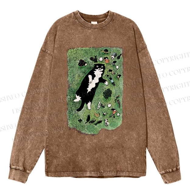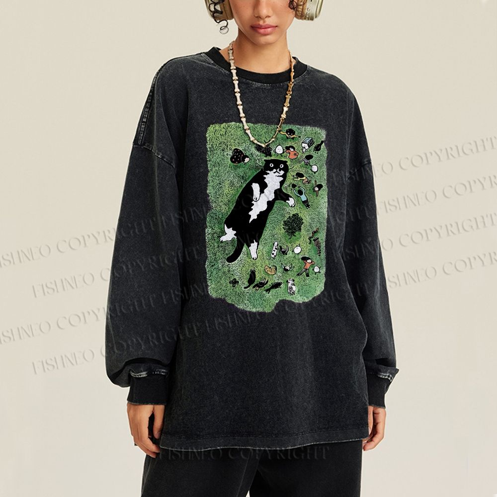 Unisex Casual Washed Cute Cat Graffiti Printed Long Sleeve T-shirt