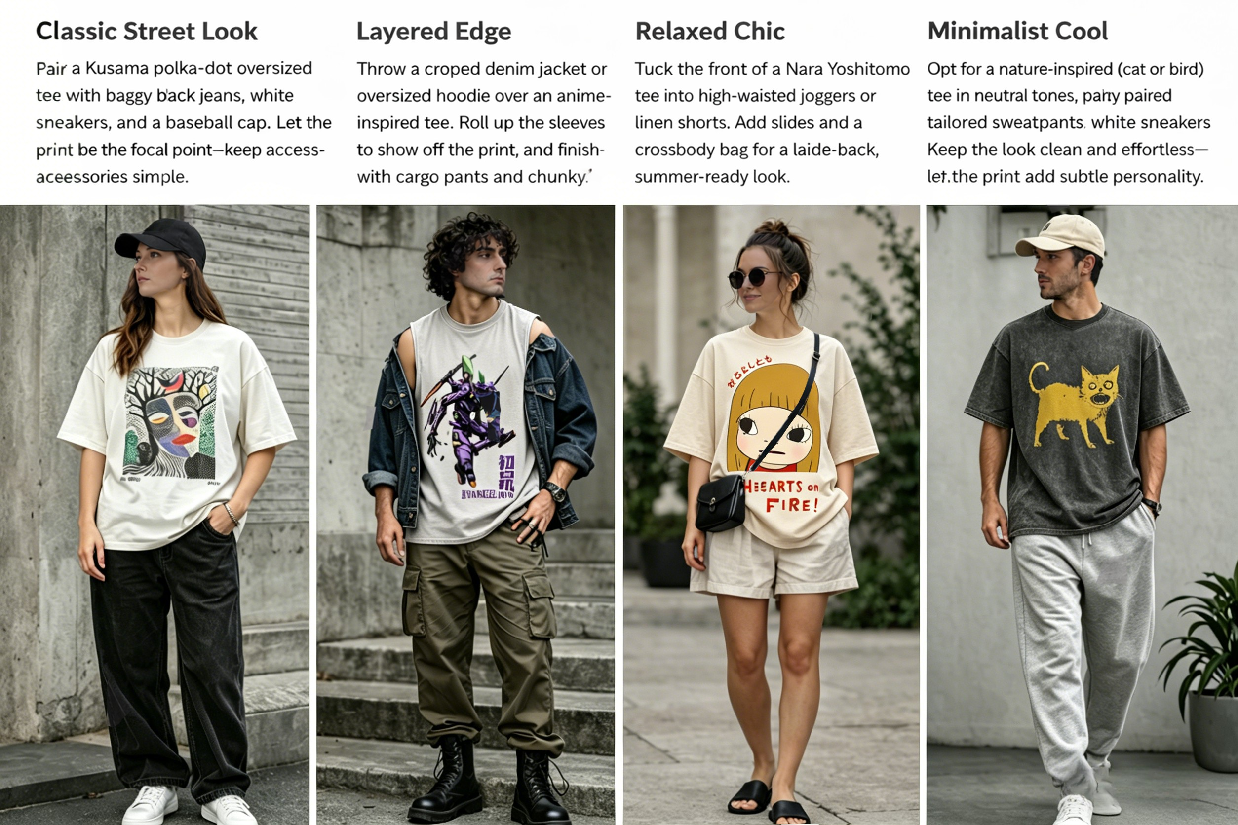 One of the best things about oversized tees is their versatility—and our Japanese prints only enhance that. Here are a few ways to style them, tailored to Western streetwear trends: