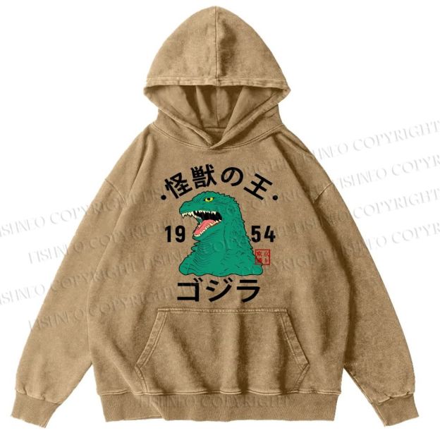 Unisex Casual Godzilla Vintage Japanese Printed Washed Hoodie