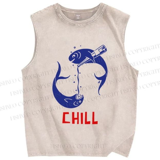 Unisex Chill Drinking Sardine Fish Printed Washed Tank Top