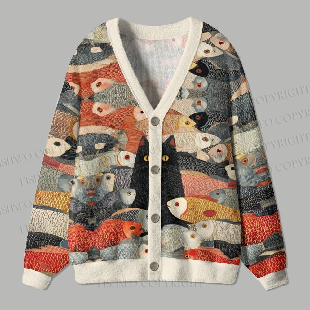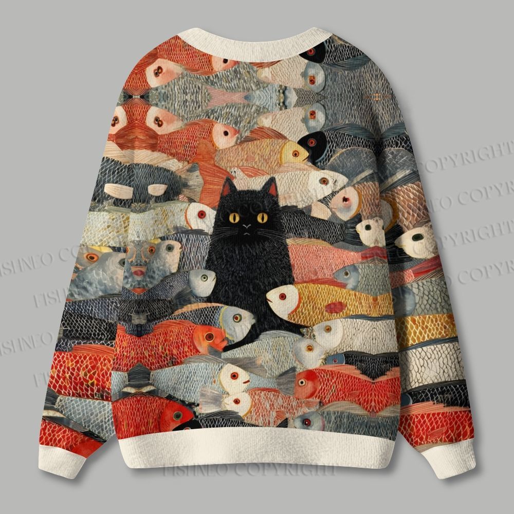 Vintage Japanese Black Cat Koi Fish Ugly Cardigan Sweater