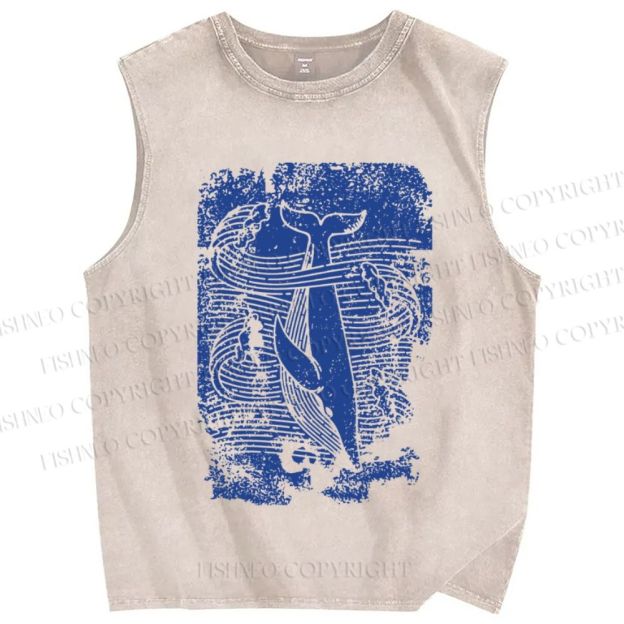 Unisex Vintage Wave Whale Printed Washed Tank Top