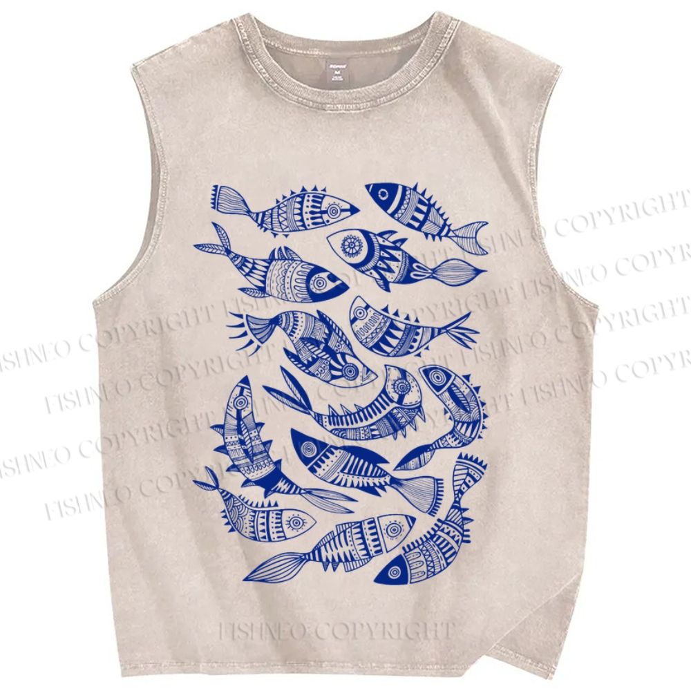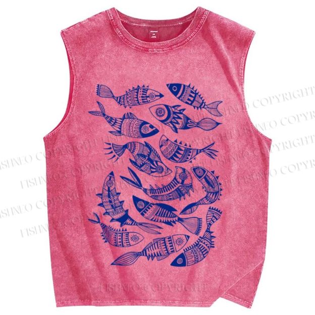 Unisex Vintage Fish Graffiti Printed Washed Tank Top