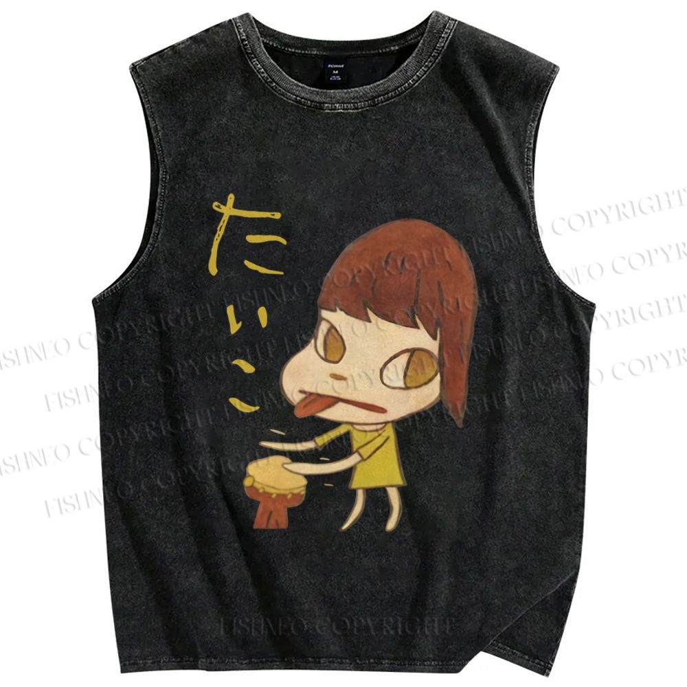 Unisex Japanese Art Yoshitomo Nara Play Drum Printed Washed Tank Top
