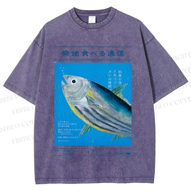 Unisex Vintage Japanese Fish Poster Printed Washed Tee