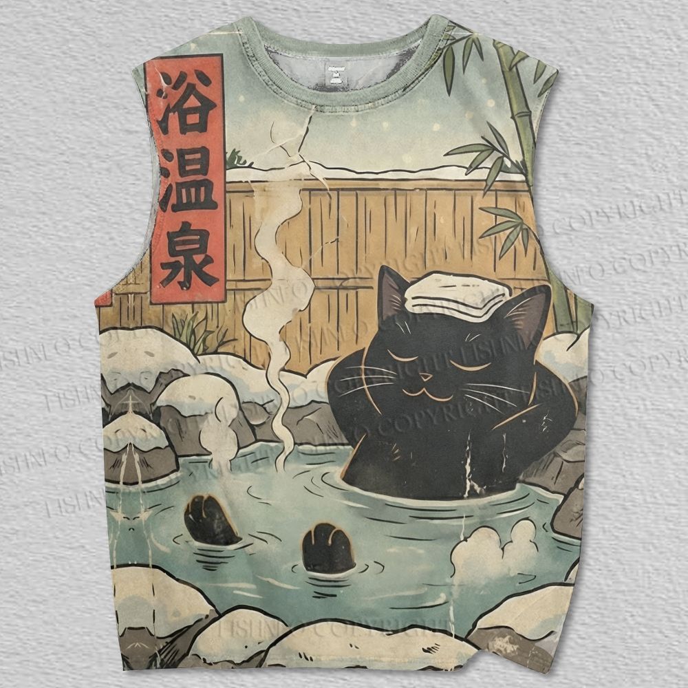 Unisex Winter Onsen Relaxed Black Cat Printed Tank Top