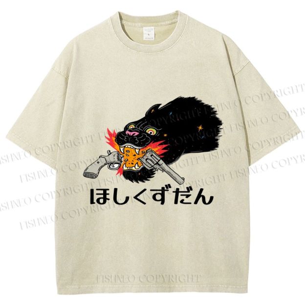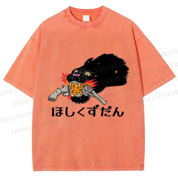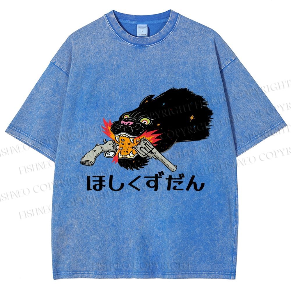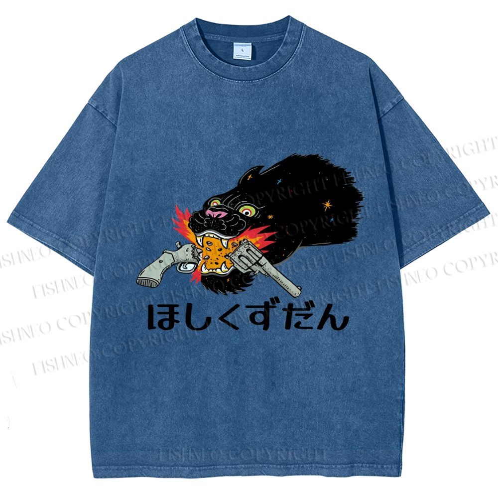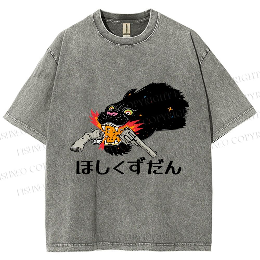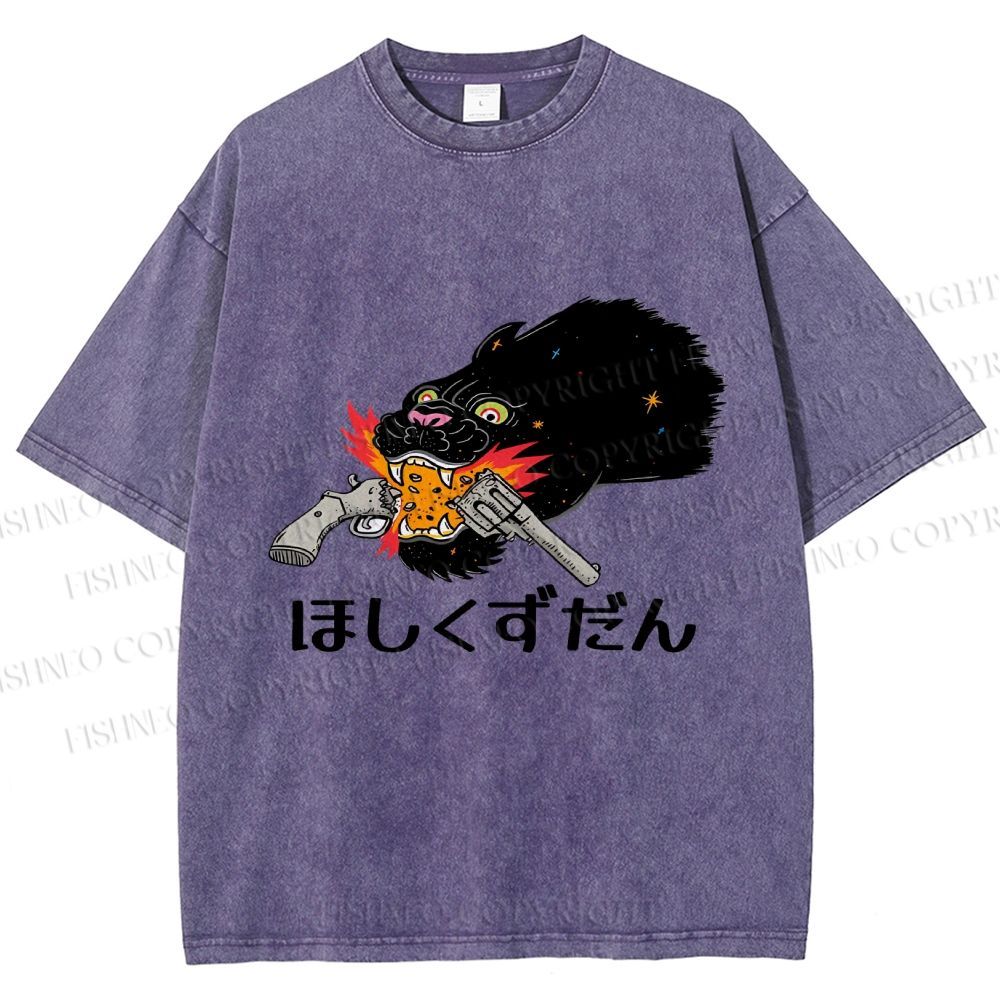 Unisex Japanese Leopard With Gun Printed Washed Tee