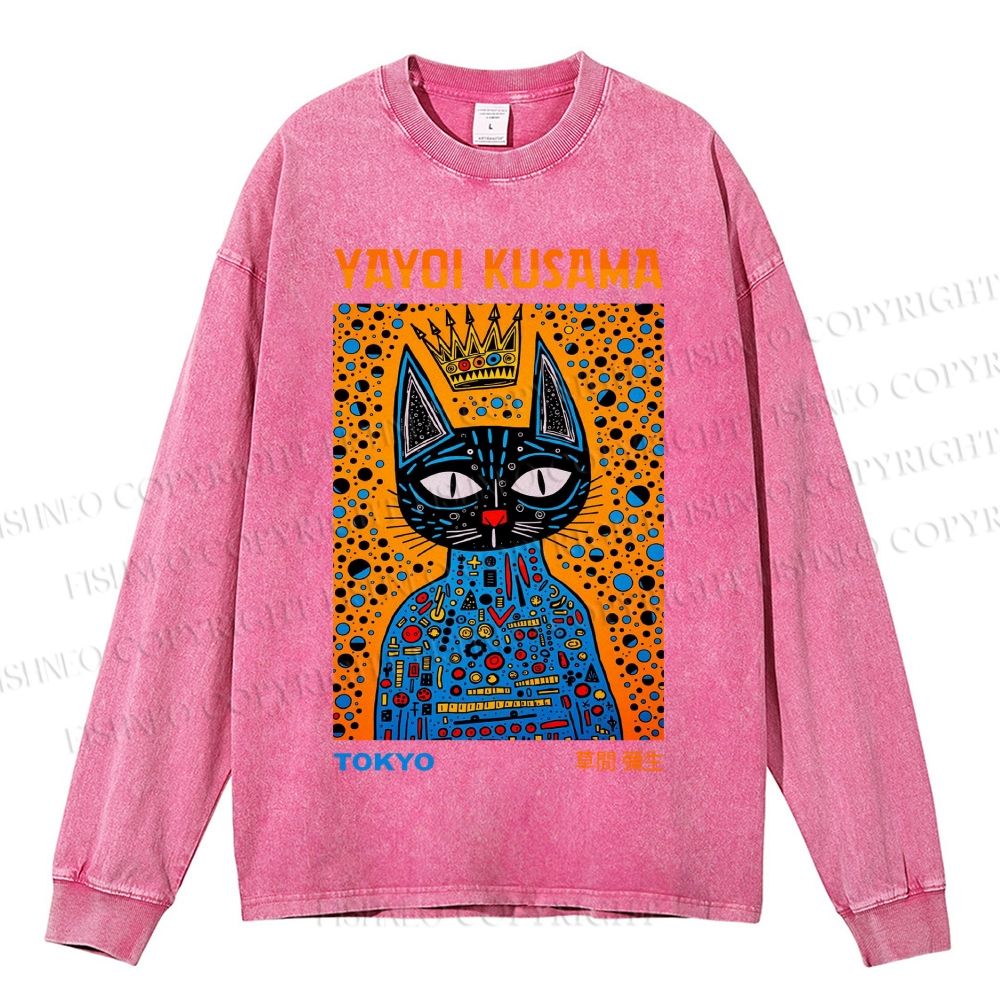 Unisex Casual Washed Japanese Yayoi Kusama Cat Printed Long Sleeve T-shirt