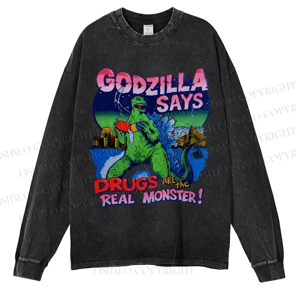 Unisex Casual Washed Godzilla Printed Long Sleeve T-shirt