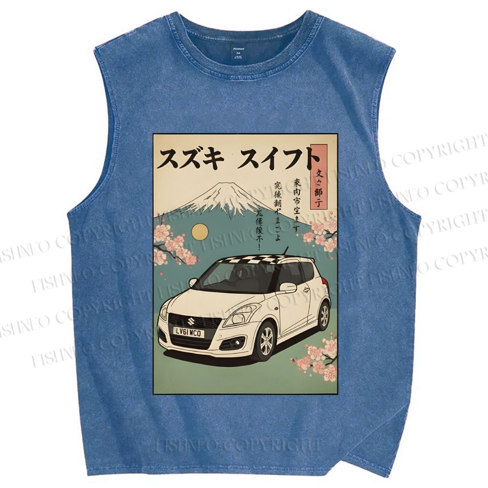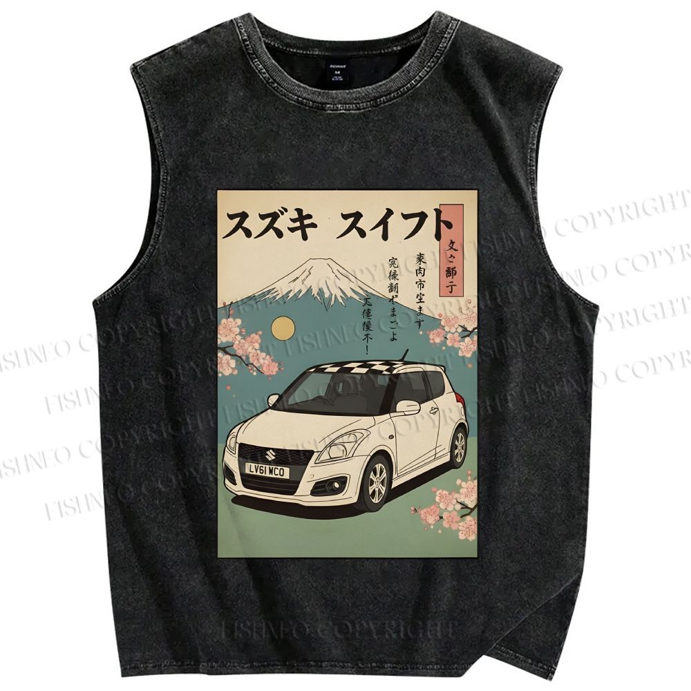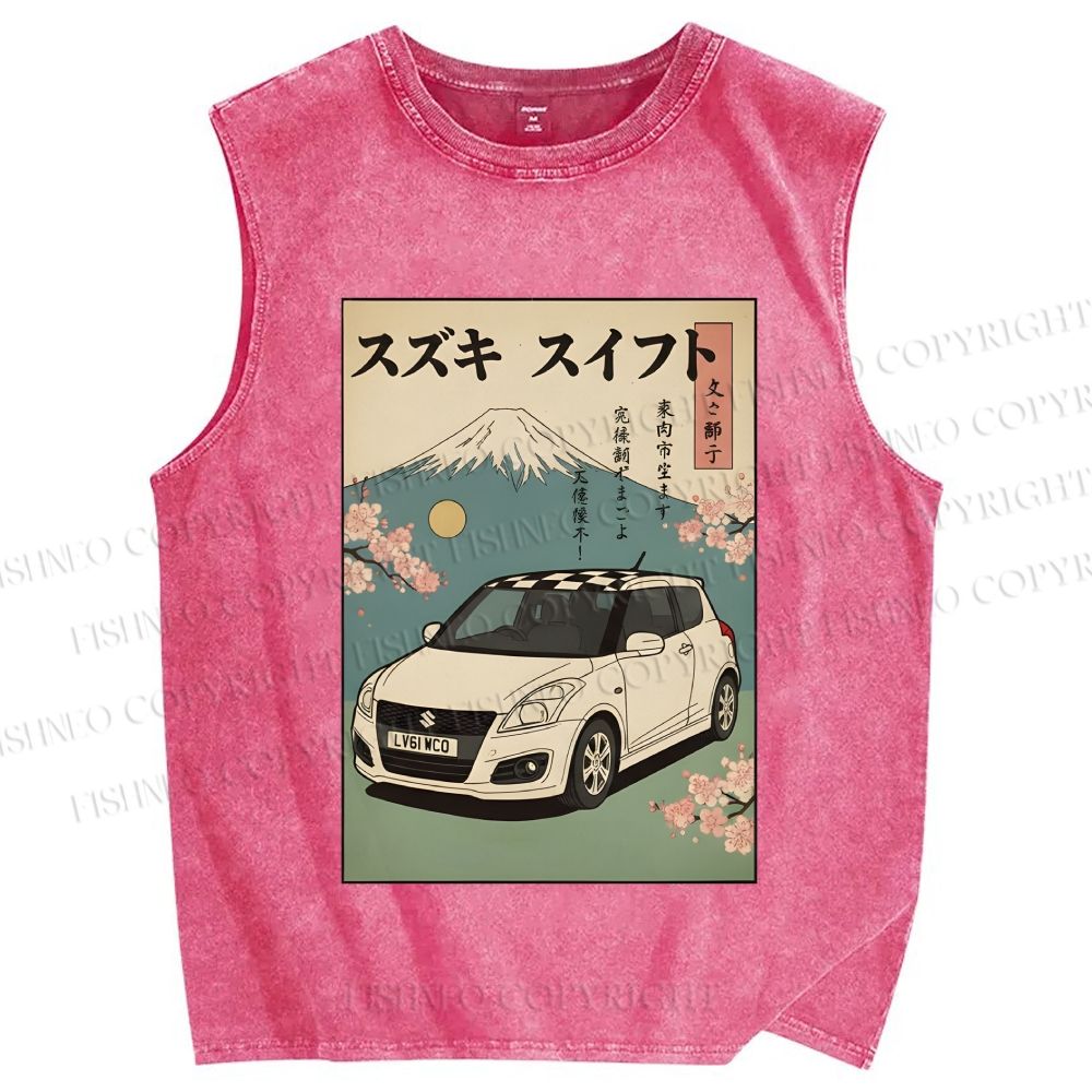 Unisex Car in Mount Fuji Japanese Printed Washed Tank Top