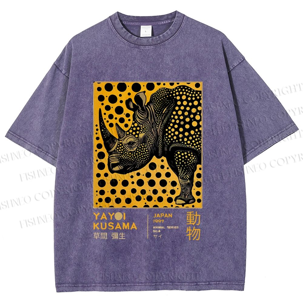 Unisex Japanese Rhinoceros Yayoi Kusama Printed Washed Tee
