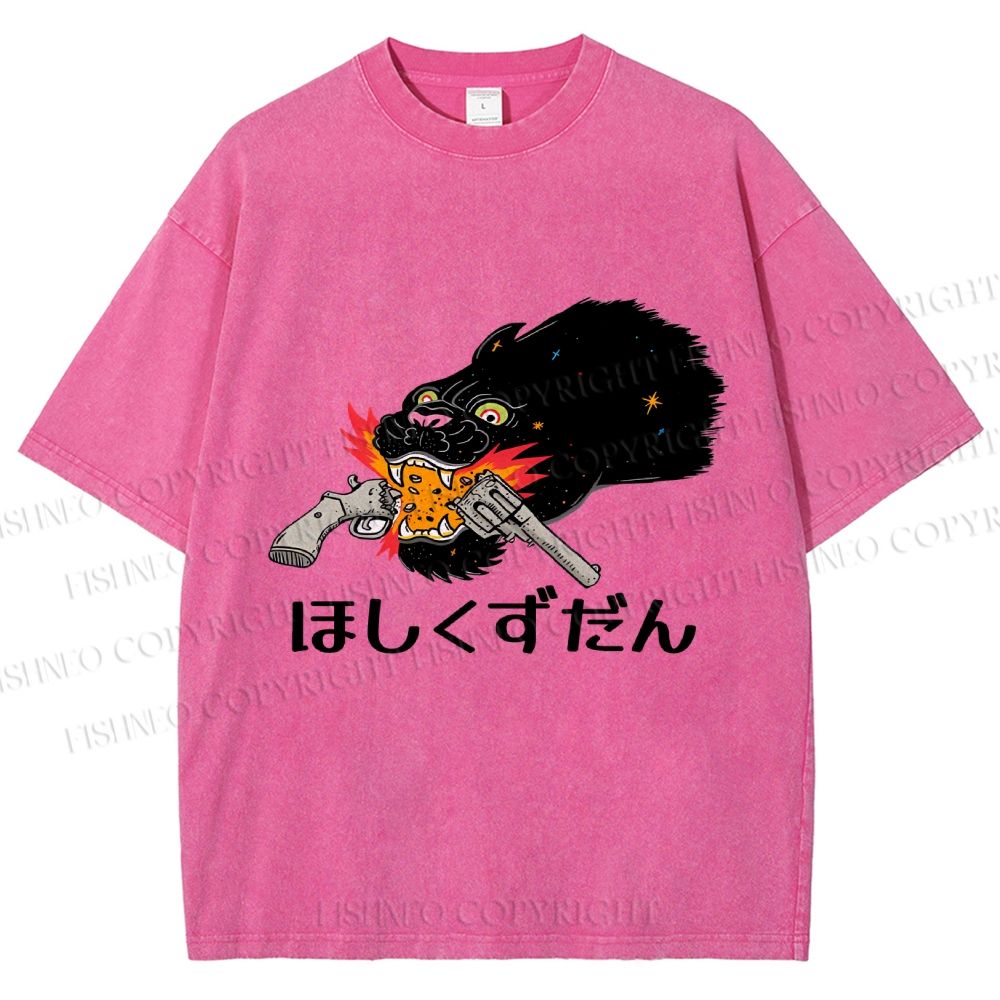Unisex Japanese Leopard With Gun Printed Washed Tee