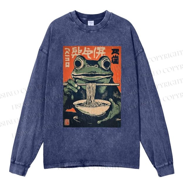 Unisex Casual Washed Frog Ramen Printed Long Sleeve T-shirt