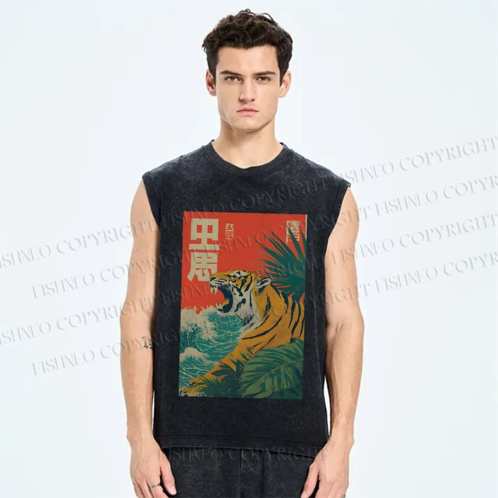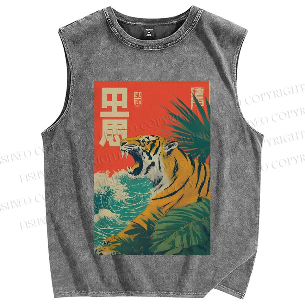 Unisex Retro Roaring Tiger Printed Washed Tank Top