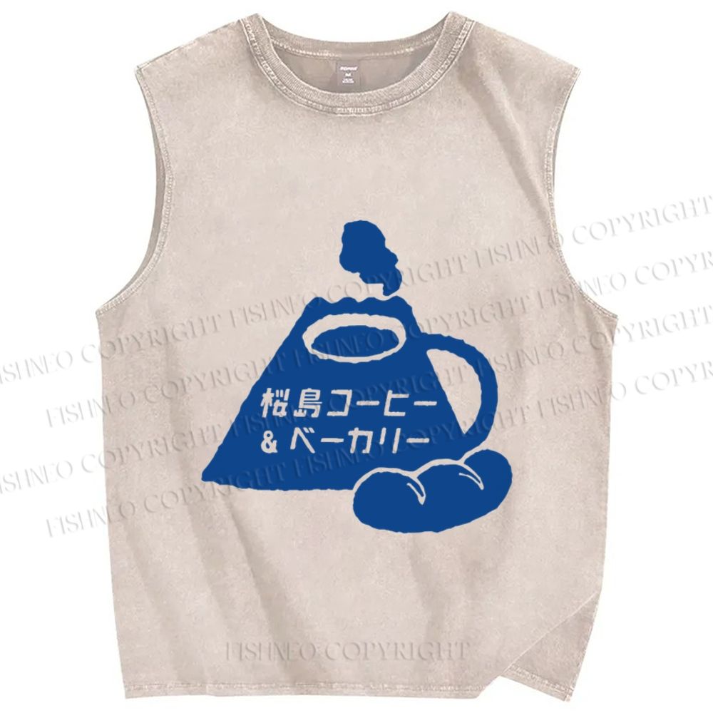 Unisex Vintage Japanese Fuji Bread Printed Washed Tank Top