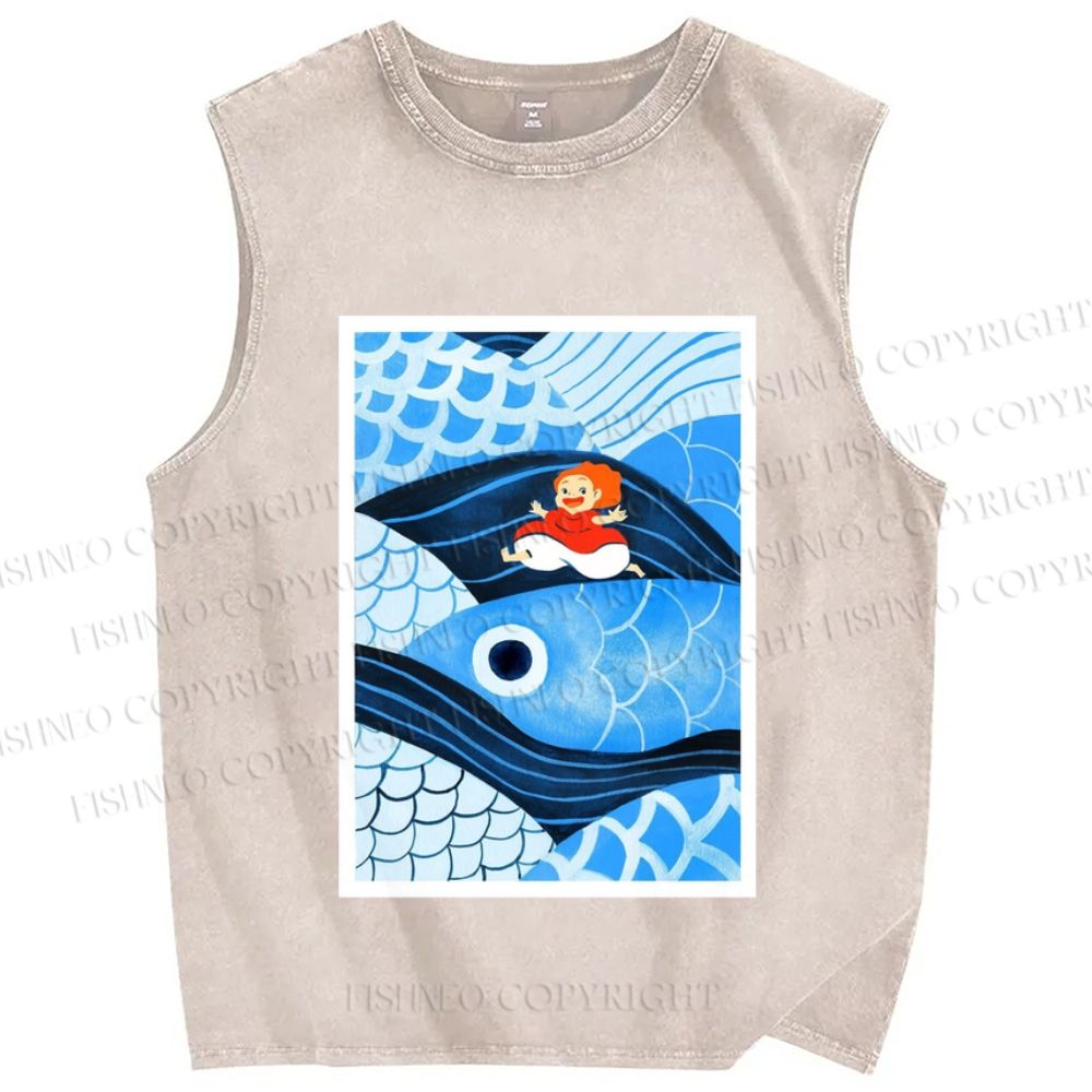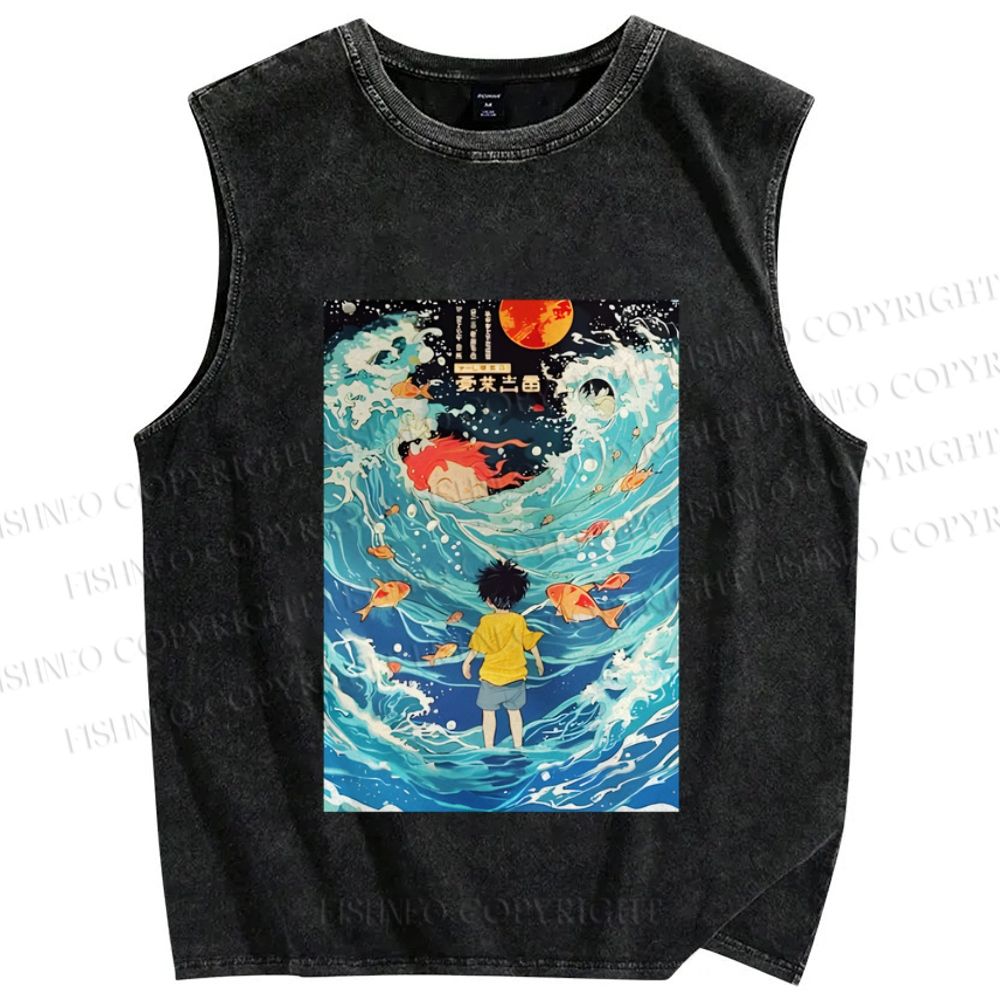 Unisex Ocean Waves Ponyo Sosuke Printed Washed Tank Top