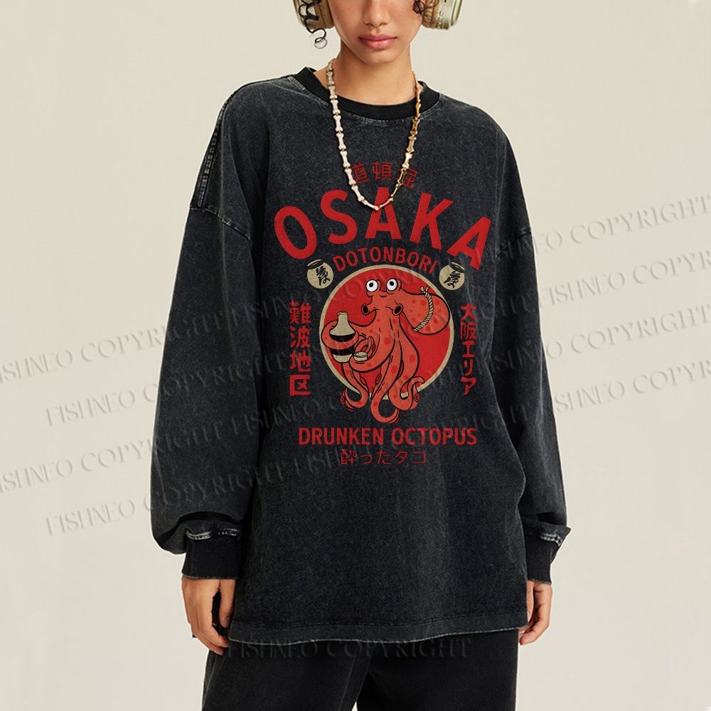 Unisex Casual Washed Osaka Drunken Octopus Vintage Printed Long Sleeve T-shirt