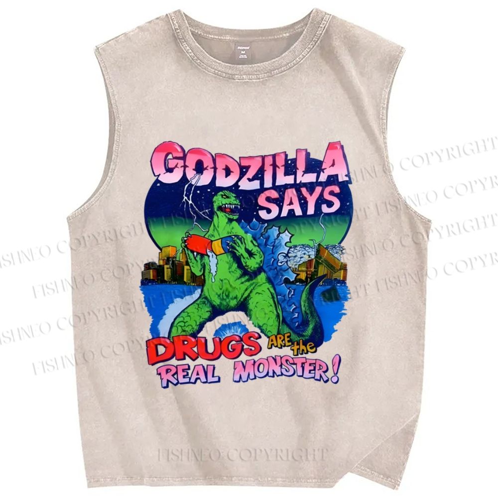Unisex Godzilla Vintage Japanese Printed Washed Tank Top