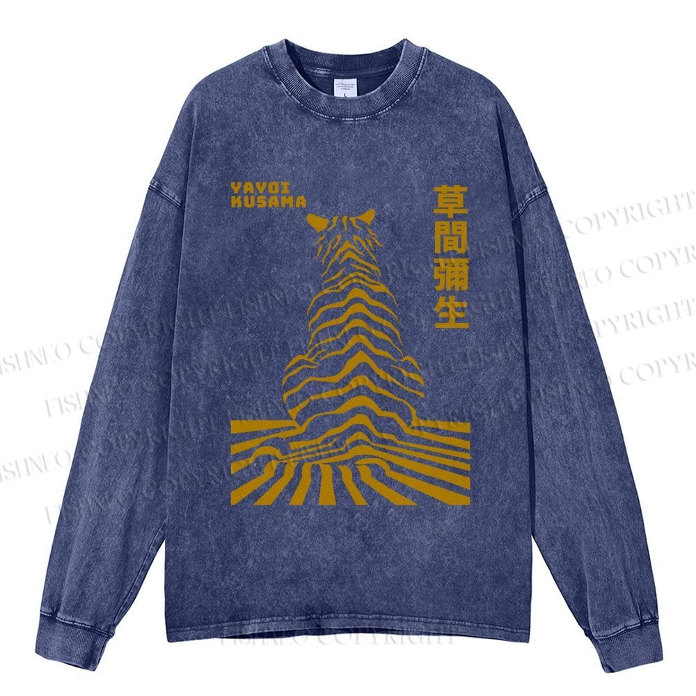 Unisex Casual Washed Japanese Yayoi Kusama Panther Printed Long Sleeve T-shirt
