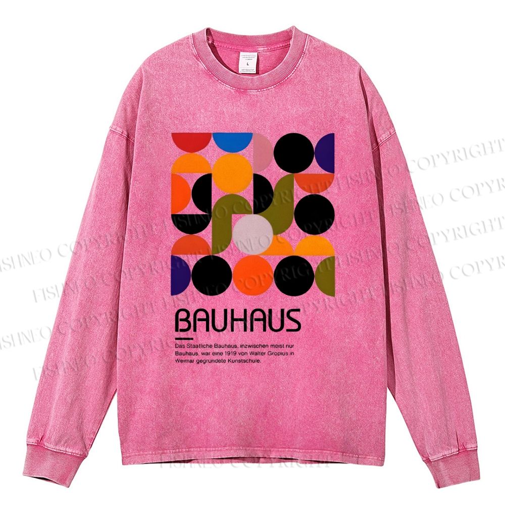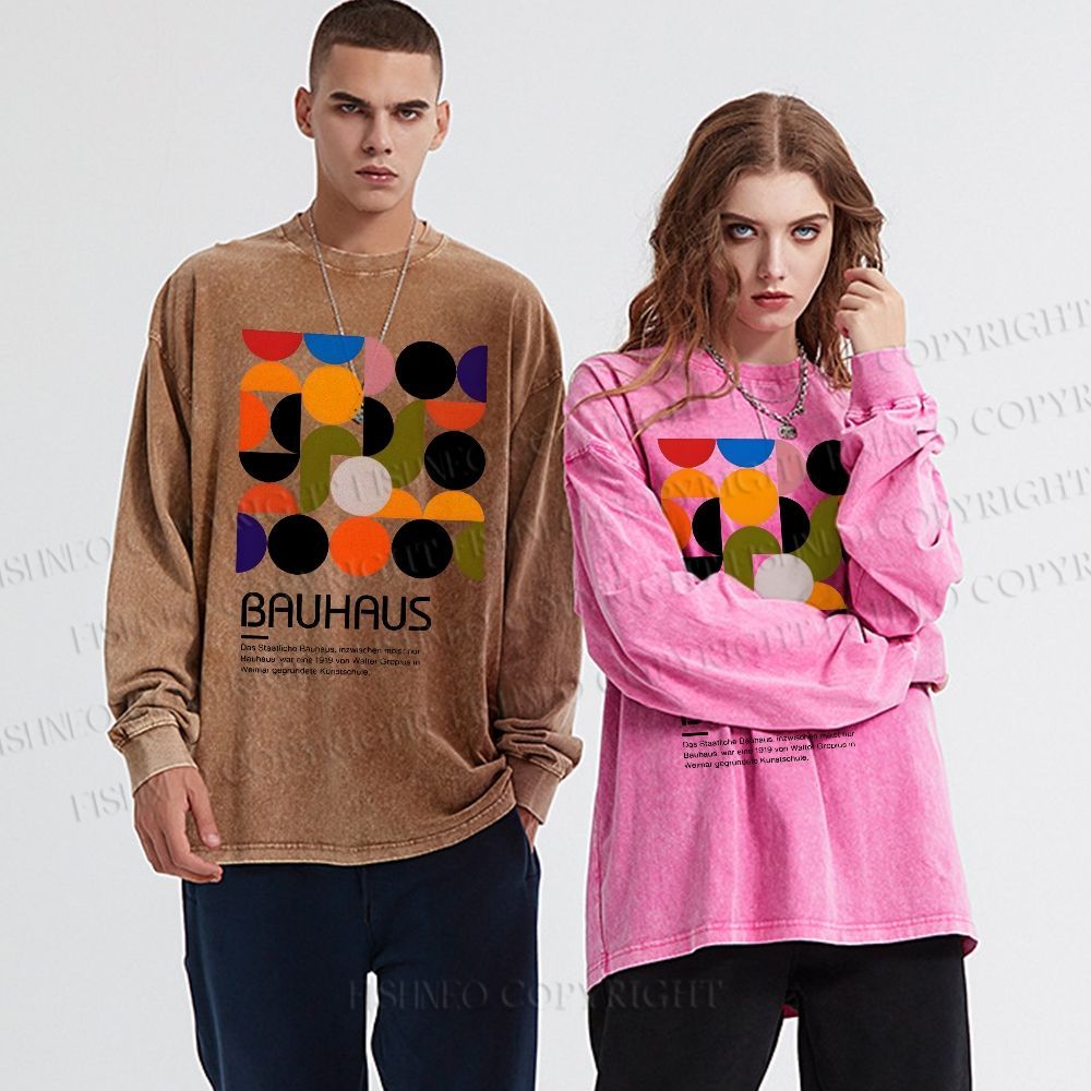 Unisex Casual Washed Vintage Bauhaus Design Printed Long Sleeve T-shirt